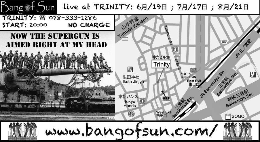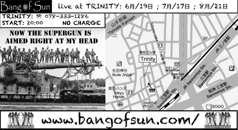 BAR TRINITY has been gracious enough to give BANG OF SUN a mini-residency. Three live shows on three different dates: the 3rd Sunday of June (6月/19日), the 3rd Sunday of July (7月/17日) & the 3rd Sunday of August (8月/21日). Of course there’ll be 3 different t-shirts to give away to a lucky audience member on each night. Each t-shirt is one-of-a-kind & all you need to do to win it is to buy a drink from the bar (it doesn’t have to be alcoholic), come up to the front of the stage & join in the win-a-t-shirt chugging contest. BAM! Free t-shirt!